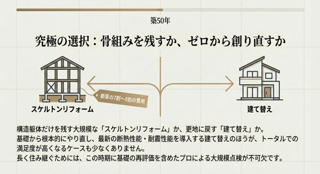 築50年を迎えた際、構造躯体だけを残して全てやり直す大規模なスケルトンリフォームを行うか、思い切って更地にして建て替えをするかの選択に迫られます。