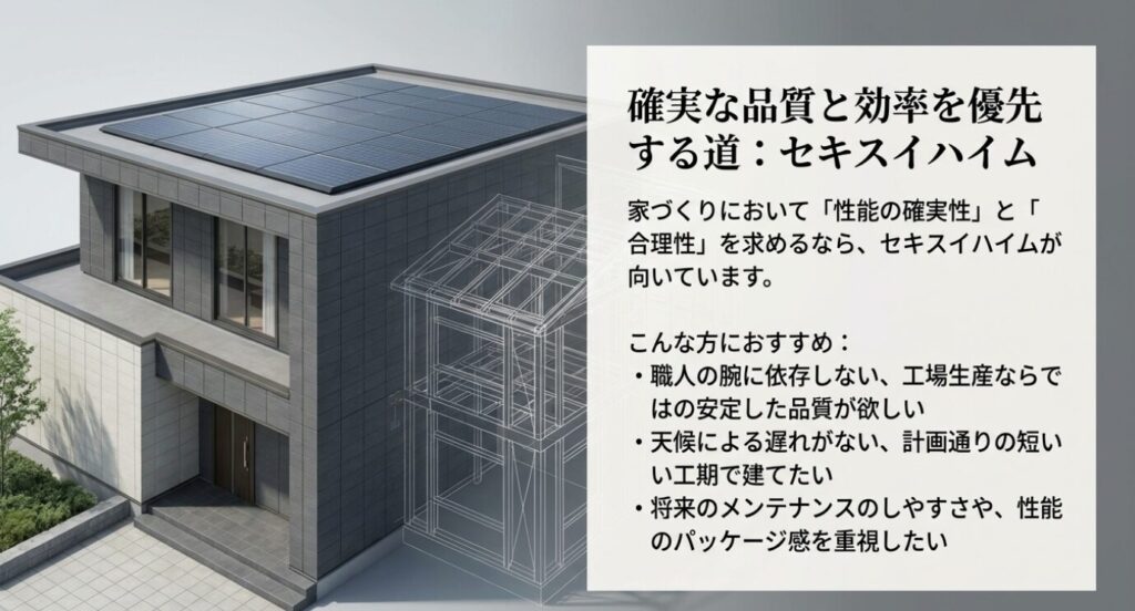 反対に、セキスイハイムが向きやすいのは、工場生産の安心感、短工期、性能の安定、将来のメンテナンス性を重視したい人です。